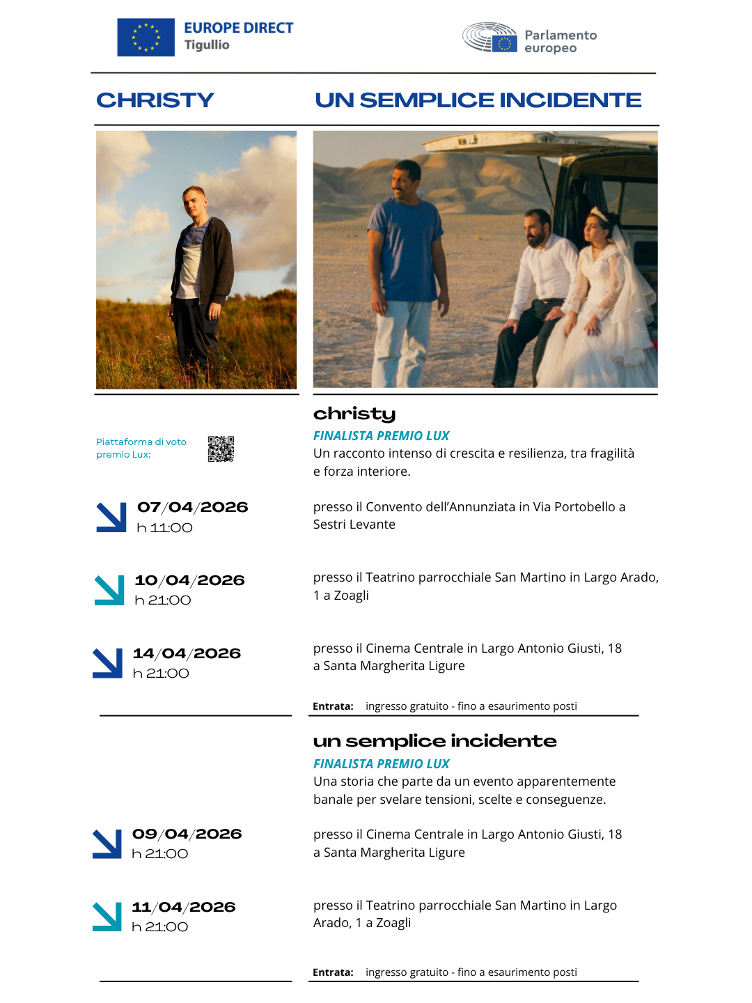 Presso il teatrino parrocchiale in Largo Arado, sarà possibile assistere alla proiezione dei film finalisti: il 10 aprile alle 21.00 "Christy", film drammatico di Brendan Canty, della durata di 94 minuti e il giorno 11 aprile alle 21.00 "Un semplice incidente", film drammatico di Jafar Panahi, della durata di 105 minuti.